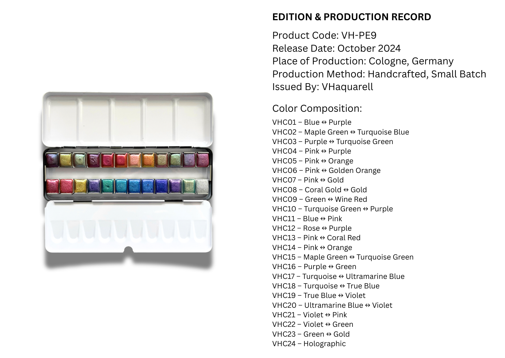 Color composition: VHC01 – Blue ↔ Purple, VHC02 – Maple Green ↔ Turquoise Blue, VHC03 – Purple ↔ Turquoise Green, VHC04 – Pink ↔ Purple, VHC05 – Pink ↔ Orange, VHC06 – Pink ↔ Golden Orange, VHC07 – Pink ↔ Gold, VHC08 – Coral Gold ↔ Gold, VHC09 – Green ↔ Wine Red, VHC10 – Turquoise Green ↔ Purple, VHC11 – Blue ↔ Pink, VHC12 – Rose ↔ Purple, VHC13 – Pink ↔ Coral Red, VHC14 – Pink ↔ Orange, VHC15 – Maple Green ↔ Turquoise Green, VHC16 – Purple ↔ Green, VHC17 – Turquoise ↔ Ultramarine Blue, VHC18 – Turquoise ↔ True Blue, VHC19 – True Blue ↔ Violet, VHC20 – Ultramarine Blue ↔ Violet, VHC21 – Violet ↔ Pink, VHC22 – Violet ↔ Green, VHC23 – Green ↔ Gold, VHC24 – Holo