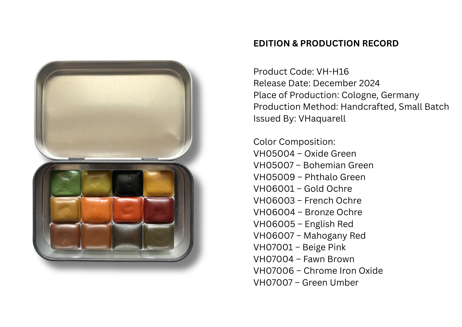 Color composition: VH05004 – Oxide Green, VH05007 – Bohemian Green, VH05009 – Phthalo Green, VH06001 – Gold Ochre, VH06003 – French Ochre, VH06004 – Bronze Ochre, VH06005 – English Red, VH06007 – Mahogany Red, VH07001 – Beige Pink, VH07004 – Fawn Brown, VH07006 – Chrome Iron Oxide, VH07007 – Green Umber