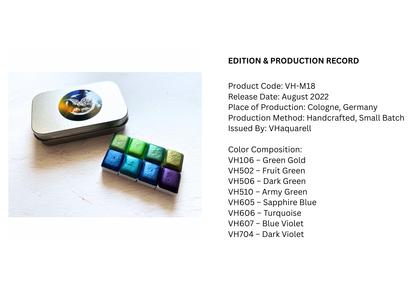 Color composition: VH106 – Green Gold, VH502 – Fruit Green, VH506 – Dark Green, VH510 – Army Green, VH605 – Sapphire Blue, VH606 – Turquoise, VH607 – Blue Violet, VH704 – Dark Violet
