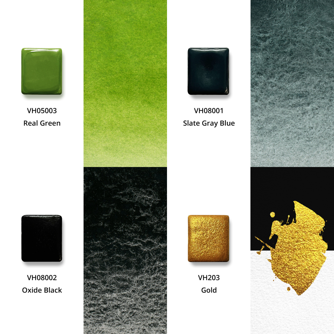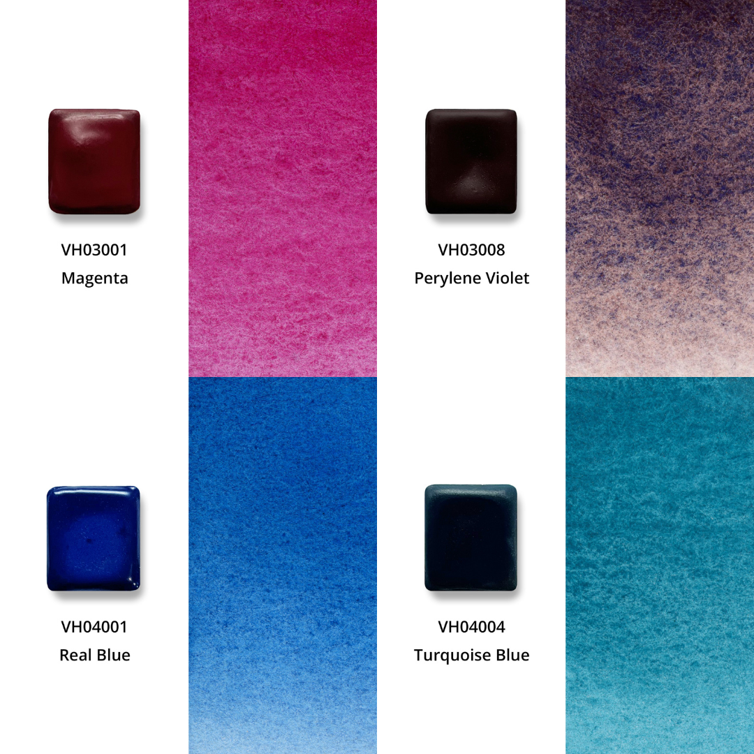 Color composition: VH0203 – Gold, VH01001 – Lemon Yellow, VH01003 – Indian Yellow, VH02001 – Vermilion Red, VH02004 – Carmine Red, VH03001 – Magenta, VH03008 – Perylene Violet, VH04001 – True Blue, VH04004 – Turquoise Blue, VH05003 – True Green, VH08001 – Slate Grey Blue, VH08002 – Oxide Black